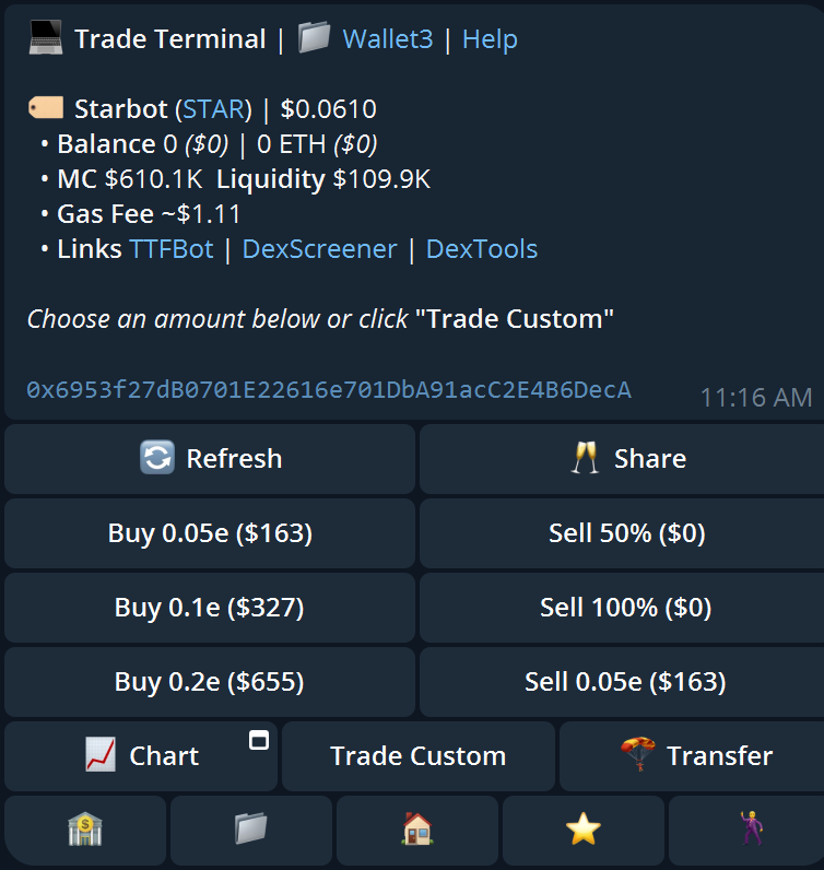 To start trading, simply paste a token address in your chat with Starbot, or forward a message containing a token address to it and Starbot will auto-detect the address. You can find addresses for your favorite ERC-20 (Ethereum) tokens from various sources, such as [www.coingecko.com](https://www.coingecko.com), [www.dextools.io](https://www.dextools.io), Telegram groups, X tweets, etc.